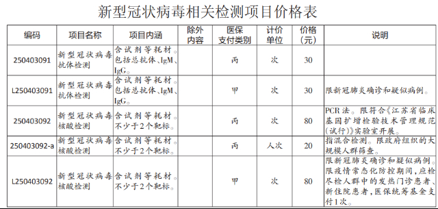 调整后,新型冠状病毒核酸检测(PCR法,不少于2个靶标)价格由120元/次降为80元/次;新型冠状病毒抗体检测(包括总抗体、IgM、IgG)价格由40元/次降为30元/次。