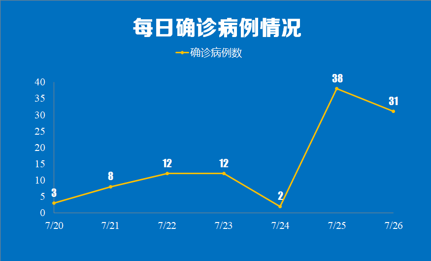 根据省卫健委7月27日发布,2021年7月26日0-24时,南京市新增新型冠状病毒感染肺炎本土确诊病例31例(其中7例为无症状感染者转为确诊病例),无新增无症状感染者;新增本土确诊病例中,轻型28例、普通型3例。有3例确诊病例由轻型转为普通型。