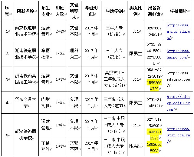 从这张表格中可以看出,南京铁道职业技术学院和湖南铁道职业技术学院,分别招收运营管理及车辆检修两个订单专业共100名学生,属于统招录取。考生只需按统招选填高校志愿一般程序报考即可。而其他三所学校则属于成人大专,定向招生,不需填报志愿。