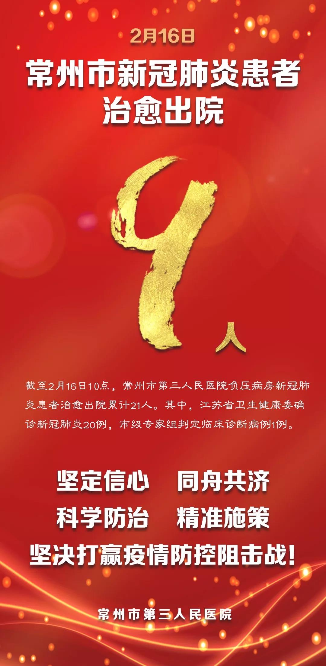 2月16日,常州市第三人民医院又传来好消息,又有9名新冠肺炎确诊患者治愈出院了。