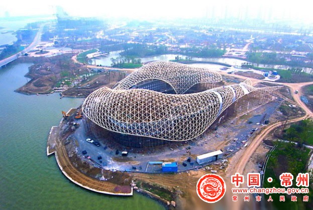 最抢眼的当属占地面积约250亩的主场馆,这是主展区内最大的异型建筑。整个主场馆滨水而建,由A、B、C、D,4个馆组成,从空中俯瞰,这4个馆组合在一起呈现出一只蝴蝶形状,同时屋顶又围合成一个“8”字形,象征着第八届中国花卉博览会。整个造型,似花似蝶,正合了本届花博会“幸福像花一样”的主题。