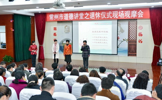 3月4日下午,我市道德讲堂之退休仪式现场观摩会在新北区春江镇小学举行。55岁的阮玉娣从春江镇计划生育服务站退休,她的亲朋好友和同事齐聚一堂为阮玉娣庆祝。