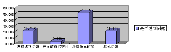 在“您在房屋交付过程中遇到过问题吗?如果遇到问题,主要是什么问题?”的调查过程中,我们发现,仅有21.74%的网友称在房屋交付过程中没有遇到问题,52.17%的网友明确表示遇到房屋质量问题,4.35%的网友遇到开发商延迟交付问题,还有21.74%的网友遇到过其他问题。