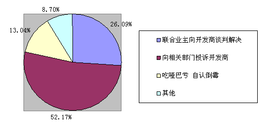 “如果在房屋交付过程中遇到问题,您会如何处理?”的调查中,有52.17%的网友选择了向相关部门投诉开发商,26.09%的网友选择了联合业主向开发商谈判维权解决,还有13.04%的网友选择了自认倒霉,8.7%的网友表示选择其他方式解决。