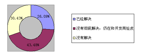 在“您曾经遇到的交房问题,是否得到解决?”的调查中,仅有26.09%的网友表示曾经遭遇的交付问题已经解决,43.48%的网友表示遭遇的问题没有彻底解决,仍在和开发商扯皮,30.43%的问题没有解决。