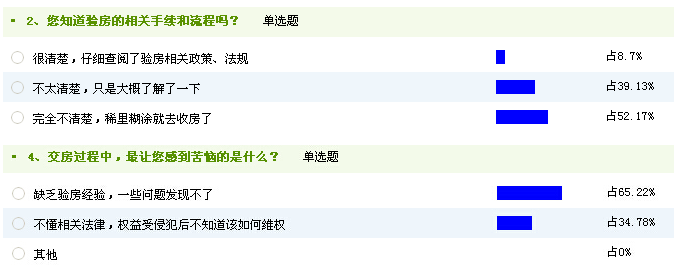 在“您知道验房的相关手续和流程吗?”“交房过程中,最让您感到苦恼的是什么?”中,仅有不到一成的网友表示“很清楚,仔细查阅了验房相关政策、法规”。