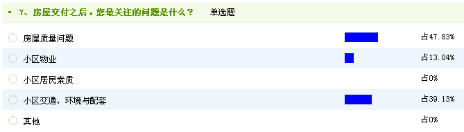 “房屋交付之后,您最关注的问题是什么?”的调查中,47.83%的网友表示房屋质量问题是最为关注的问题,其次,39.13%的网友表示“小区交通、环境与配套”为关注的焦点,最后,13.04%的网友选择“小区物业”为房屋交付后关注的焦点。