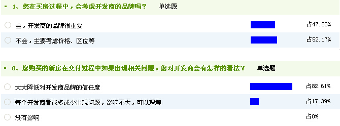 通过上面两个问题我们可以看到,在购买住房时,有近五成的购房者会考虑到开发商的品牌效应,如果在房屋交付过程中产生了任何问题,无论是质量问题,还是延期交付,都会影响到购房者对开发商品牌的印象。