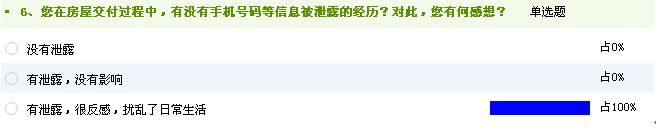 同时,在购房者房屋交付之后,是否遇到过信息泄露这个事情,参与调查的网友全部表示“有没有手机号码等信息被泄露的经历”,并且很反感。