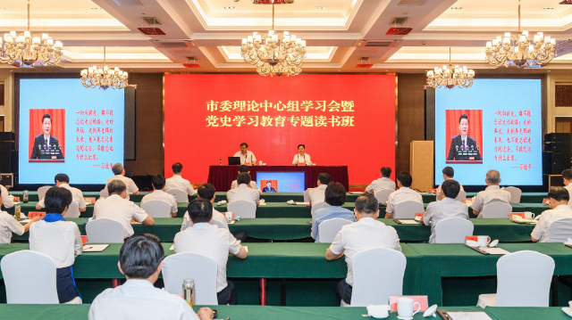 根据市委党史学习教育部署安排,市委理论中心组于6月25-26日举行学习会暨党史学习教育专题读书班,市四套班子全体领导利用两天时间开展集体学习。市委书记、市委党史学习教育领导小组组长陈金虎强调,要深入学习贯彻习近平总书记重要讲话和指示精神,自觉从党的百年历史中汲取砥砺奋进的精神力量,真正做到学史明理、学史增信、学史崇德、学史力行,把学党史、悟思想的成效体现到办实事、开新局上。省委党史学习教育第二巡回指导组组长刘广忠、副组长吴雪晴到会指导。