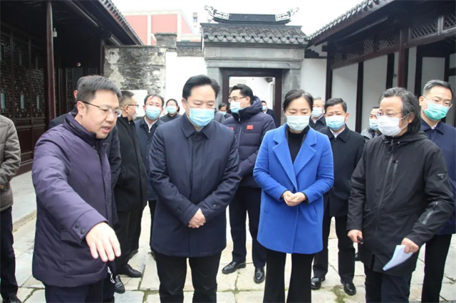 陈金虎、盛蕾一行首先来到文化宫片区、盛宣怀故居片区,实地了解项目实施情况。目前,盛宣怀故居作为青果巷的西大门,完成了故居本体的修缮及建筑织补方案。文庙大成殿在考古挖掘的基础上,完成了现状整修和保养工作。意园史干甫宅本体修缮工程已完成,内外园、织补区等相关工程持续推进。同时,常州市通过大力推进市河清水工程,基本完成对东市河、南市河、北市河、西市河和锁桥河河道的生态补水及水环境治理,构建以沉水植物为主的“水下森林净化系统”,加速生态系统恢复。陈金虎、盛蕾指出,老城厢复兴发展启动以来,老城厢复兴发展领导小组各成员单位担当作为、凝心聚力、真抓实干,青果巷历史文化街区二期、盛宣怀故居、夏家大院等项目顺利推进,常州三杰纪念馆修缮高标准完成,文化宫广场整体提升,取得了阶段性的成果。