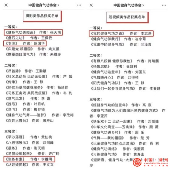 近日,中国健身气功协会公布了2022年“盘石”杯全国健身气功作品征集大赛获奖名单,常州共有4人获奖,其中,李志燕获得短视频类作品一等奖,张天南、陈国华获得摄影类作品一等奖,李维明获得摄影类作品三等奖。