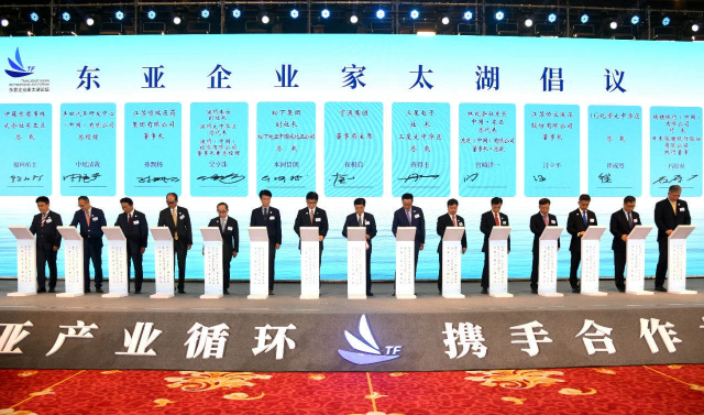 江苏恒瑞医药集团有限公司等企业围绕生物医药和健康产业合作、新一代信息技术产业合作、高端装备和新能源产业合作进行了大会交流。论坛期间,现场共签约55个日资韩资项目,总投资78亿美元。江苏日韩企业人才服务合作云联盟正式启动。来自江苏和日本、韩国的15家企业代表共同发布了东亚企业家太湖倡议。