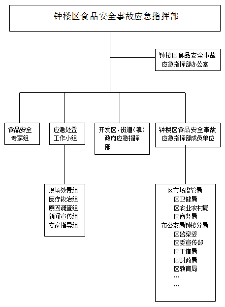 特别重大食品安全事故(Ⅰ级)、重大食品安全事故(Ⅱ级)和较大食品安全事故(Ⅲ级)发生后,随即启动特别重大(Ⅰ)、重大食品安全事故(Ⅱ)、较大食品安全事故(Ⅲ级)和一般食品安全事故(Ⅳ级)应急响应,区食品安全委员会即转为区食品安全事故应急指挥部。区食品安全事故应急指挥部统一领导、指挥食品安全事故应急处置工作,应急指挥部成员为区食品安全委员会成员单位。区食品安全事故应急指挥部下设办公室,设在钟楼区食品安全委员会办公室,负责日常工作。