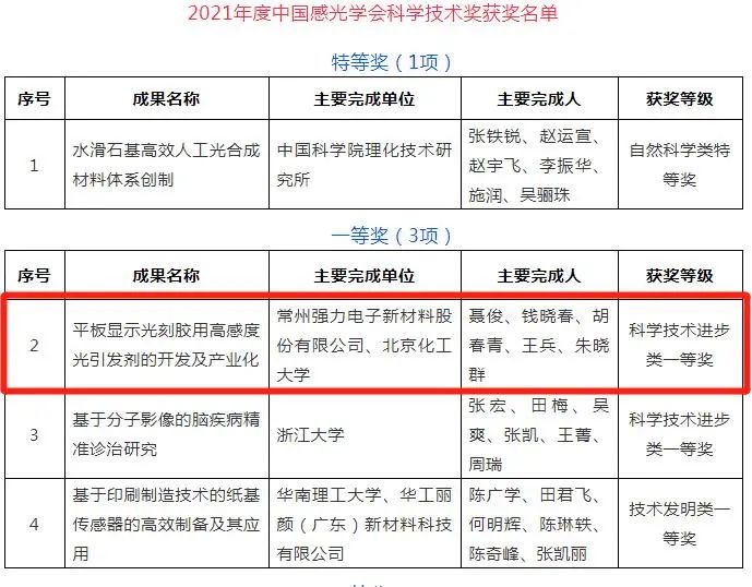 近日,从中国感光学会传来喜讯,经开区又斩获一项国家级科技奖项!来自常州经开区的常州强力电子新材料股份有限公司和北京化工大学共同完成的“平板显示光刻胶用高感度光引发剂的开发及产业化”项目荣获科学技术进步奖一等奖。