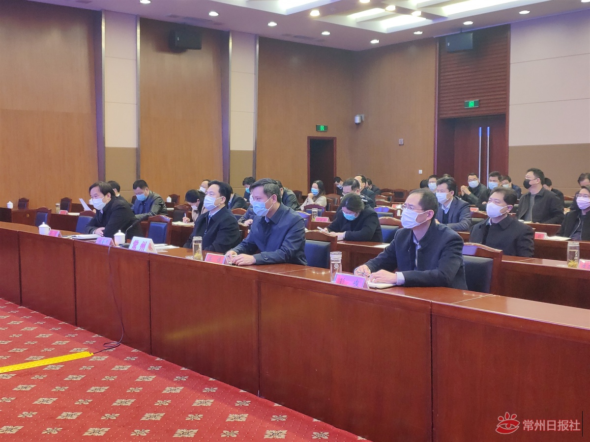 代理市长陈金虎、副市长蒋锋和市政府秘书长杭勇在常州分会场收听收看会议。