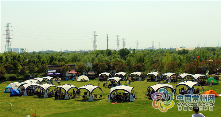 5月5日,在常州市嬉乐湾生态农业示范园,游客们在草地上的帐篷里快乐地吃着烧烤。