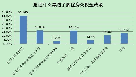 为了提高住房公积金宣传的针对性,提升政策宣传效果,本次调查市公积金中心特意对职工经常使用了解信息的渠道进行调查。在“您一般通过什么渠道了解我市住房公积金政策调整的内容”的问题中,设计了包括网站、微博、微信、电视广播、报刊杂志等多种渠道,经网民投票,我市住房公积金管理中心网站、常州住房公积金微信公众号、电视新闻广播等三个渠道占比最多,分别是35.16%、16.89%和16.44%。