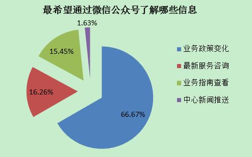 在“您认为最方便了解住房公积金政策内容的途径是哪个?”的问题中,46.34%的职工选择了微信公众号,这与当今社会新媒体快速发展的趋势特征相吻合。紧随其后的是住房公积金网站,选择职工占比达到34.96%,选择12329服务热线的职工占比5.69%。通过调查我们还了解到,目前有47.97%的职工关注了我市住房公积金微信公众号,职工最希望通过微信公众号了解的信息就是住房公积金业务政策的变化,占比66.67%,随后是服务咨询类信息,占比16.26%,业务指南类占比15.45%,中心动态推送占比1.63%。