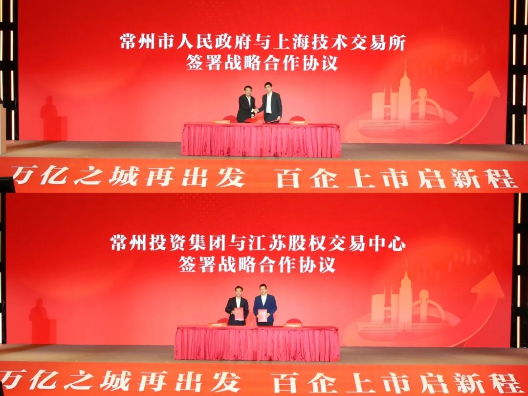 常州市政府与上海技术交易所签署战略合作协议,进一步深化合作、资源共享,共同推动国内外先进科技成果落户常州。常州投资集团与江苏股权交易中心签署战略合作协议,江苏股交常州服务基地将正式入驻龙城金谷,发挥区域性股权市场功能,提高金融服务实体经济质效。