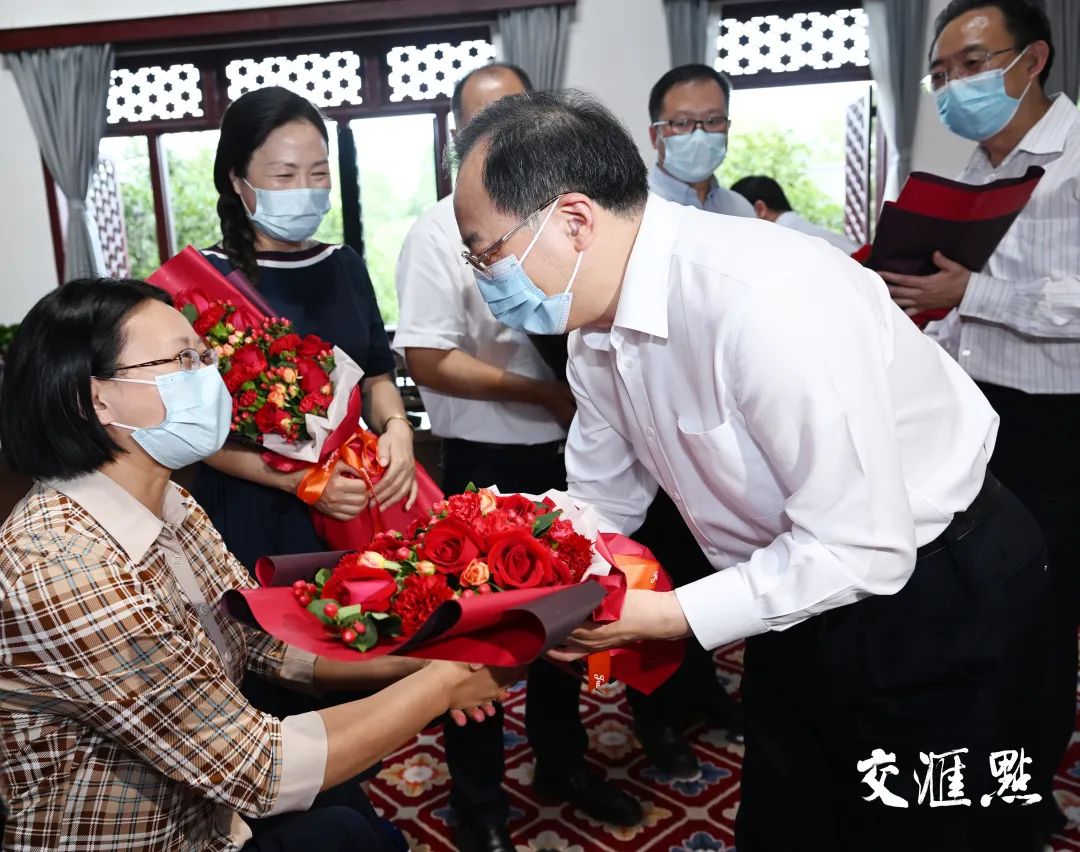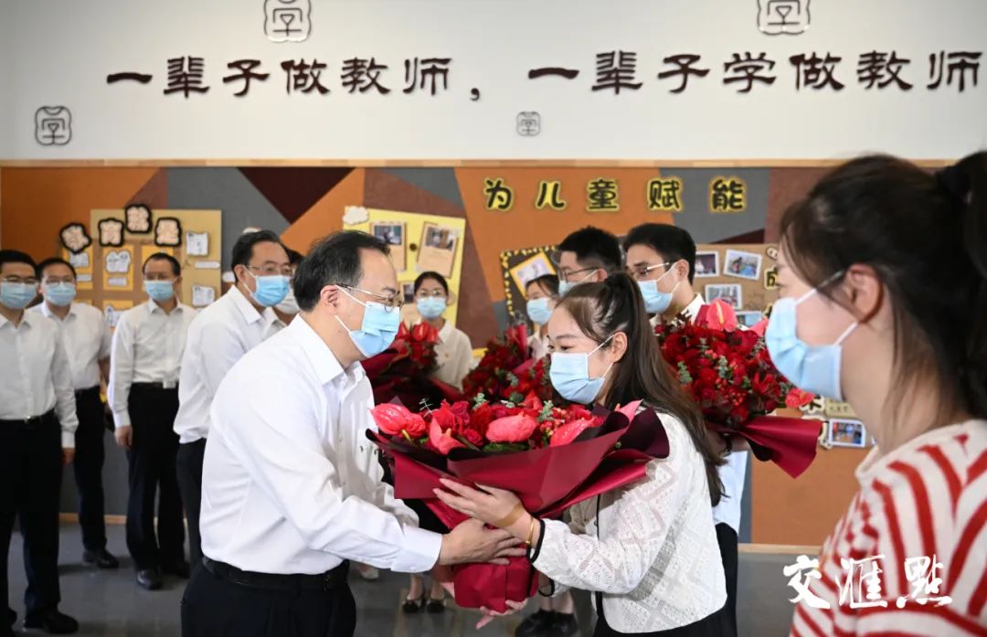 吴政隆与教师代表们交流,并送上鲜花和节日美好祝福。他说,学高为师,身正为范。一代又一代南师大的教育人传承师道、薪火相传,为党的教育事业付出了巨大心血。师范院校是培养教师的主阵地。希望大家落实好立德树人根本任务,捧着一颗心来、不带半根草去,做学生为学、为事、为人的“大先生”,做党和人民满意的“四有”好老师。学校要高度重视教师队伍建设,突出全员全方位全过程师德养成,用“优秀的人”培养“更优秀的人”。调研中,吴政隆指出,长期以来,南京师范大学为国家、为江苏各项事业发展输送了优秀人才、作出了重要贡献。今年是南师大建校120周年,我代表省委、省政府向全校师生员工、广大校友表示祝贺和问候。希望学校深入学习贯彻习近平总书记关于教育的重要论述,深刻领悟“两个确立”的决定性意义,坚持党的领导,坚持用习近平新时代中国特色社会主义思想凝心铸魂,坚持为党和人民事业服务,为党育人、为国育才,努力在新起点上再创新辉煌。