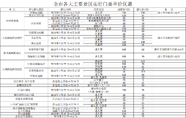 活动具体分为“感恩普惠游”“情满龙城游”“致敬免费游”“超值文化游”“文化惠民游”“乡野踏青游”等几大板块,紧紧围绕惠民、感恩、送温暖等主题。活动期间,全市21个重点收费景区门票半价,在此基础上还有淹城双园门票1元秒杀,天目湖山水园、南山竹海、御水温泉1元秒杀等特惠活动;开通春季乡村旅游免费专线车,旅行社推出让利优惠产品,让大家走出家门赏花踏青;全市文化单位开展各类公益文化活动,丰富市民文化生活。