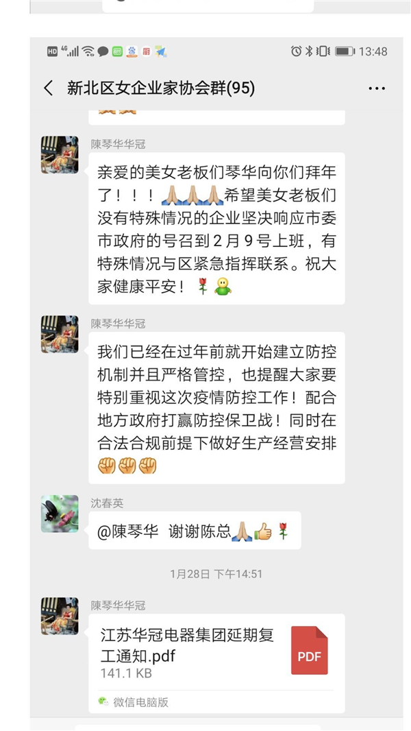 疫情发生以来,罗溪镇妇联积极发动女企业家、女能手、巾帼文明岗、巾帼志愿者、三八红旗手和基层妇女群众投身抗疫工作。常州市人大代表、江苏华冠电器集团有限公司董事长陈琴华是新北区女企业家协会会长,她第一时间响应政府号召,及时告知女企业家们按照政府要求延后复工,引导大家理性对待疫情,积极支持配合做好防疫防控工作,在华冠电器第一时间成立防疫应急领导小组,鼓励本地员工参加志愿服务,自己带头捐款, 同时呼吁女企业家们在做好本人防控疫情的同时,尽自己的努力,积极捐献爱心,在疫情面前展现女企业家的责任担当。 莫栋华 新北区人大代表,罗溪镇温寺村党总支书记