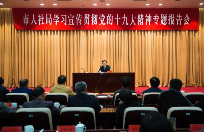 11月15日下午,市人社局在市行政中心一楼群贤堂召开学习宣传贯彻党的十九大精神专题报告会。局机关全体、省常技领导班子成员、局属非校事业单位中层正职以上干部、局系统全体党务干部(支委委员)、党建工作联络员、局工会、团委、妇委会委员共计180余人参加了会议。