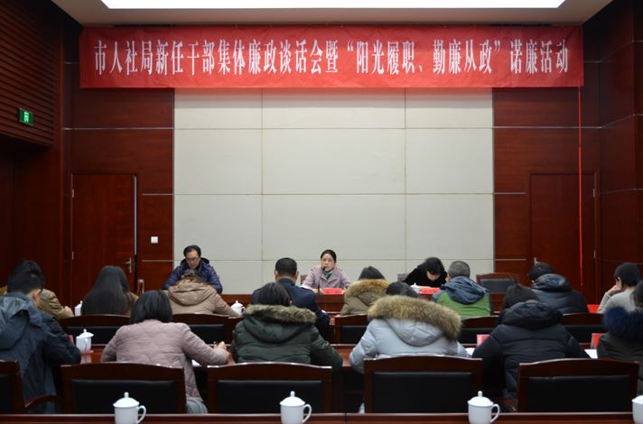 1月12日上午,市人社局在市行政中心勋业厅召开新任干部集体廉政座谈会暨“阳光履职、勤廉从政”诺廉活动。市人社副局长、机关党委书记苏叶同志作讲话,市纪委第七派驻纪检组副处级纪检员范文蔚到场指导,副局长许伟树主持会议。
