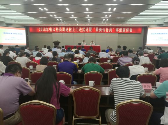 7月19日,2018年省公务员局送教上门进武进暨“最美公务员”事迹宣讲会在武进区行政中心一号楼二楼会议室隆重召开。宣讲会由武进区人社局副局长陈志华主持,常州市人社局副局长苏叶、公务员考培处处长顾赛男等同志和武进区300名公务员代表参加了会议。
