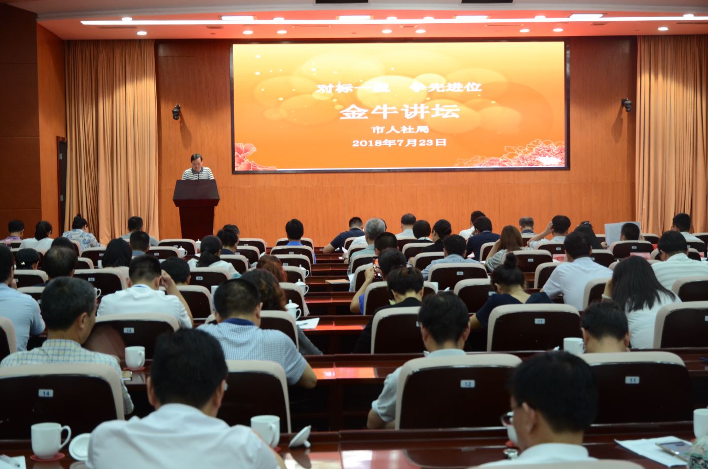 为进一步把解放思想大讨论的要求落实到人社工作具体实践中,激发全局干部职工干事创业、奋发进取的热情,培育敢于担当、务实高效的作风,推进全局工作改革创新,更上层楼,7月23日下午,市人社局在行政中心群贤堂举办了一场“对标一流、争先进位”主题金牛讲坛,局组织人事处处长周淑君主持会议。