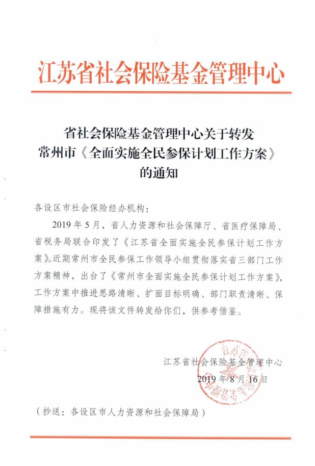 8月16日,江苏省社会保险基金管理中心向全省各设区市社会保险经办机构发出通知,推广常州市《全面实施全民参保计划工作方案》。省社保中心指出,常州市全民参保工作方案推进思路清晰、扩面目标明确、部门职责清晰、保障措施有力。要求各地社保经办机构参考借鉴。