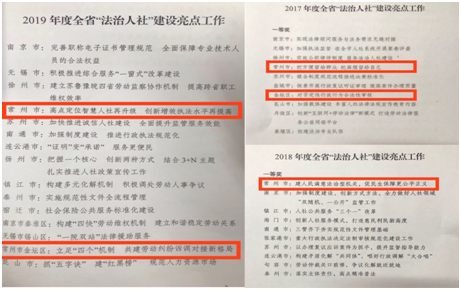把麻烦留给自己”、“对否定性行政行为合法性审核”,2018年度“建人民满意法治型机关 促民生保障更公平正义”均被评为全省“法治人社”亮点工作一等奖;2019年度在不再设评比等次的情况下,市、区项目双双入选,持续在全省人社系统提交了常州“法治人社”建设的优异成绩单。