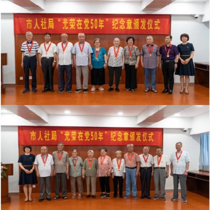 一百年波澜壮阔,五十载初心如磐。在中国共产党百年华诞即将来临之际,6月28日下午,市人社局隆重举行“光荣在党50年”纪念章颁发仪式。局党组书记、局长嘉秀娟向19名老党员代表颁发“光荣在党50年”纪念章。机关离退休支部4名党员代表作了铿锵有力的交流发言,带领大家重温了那段峥嵘岁月、再忆了那段光荣历程,展示了作为一名老党员的崇高理想和坚定信念。仪式由局机关党委专职副书记王红俊主持,40余名离退休老党员代表参加。