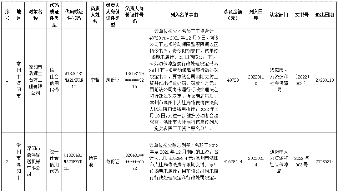 常州市2022年1月拖欠农民工工资黑名单