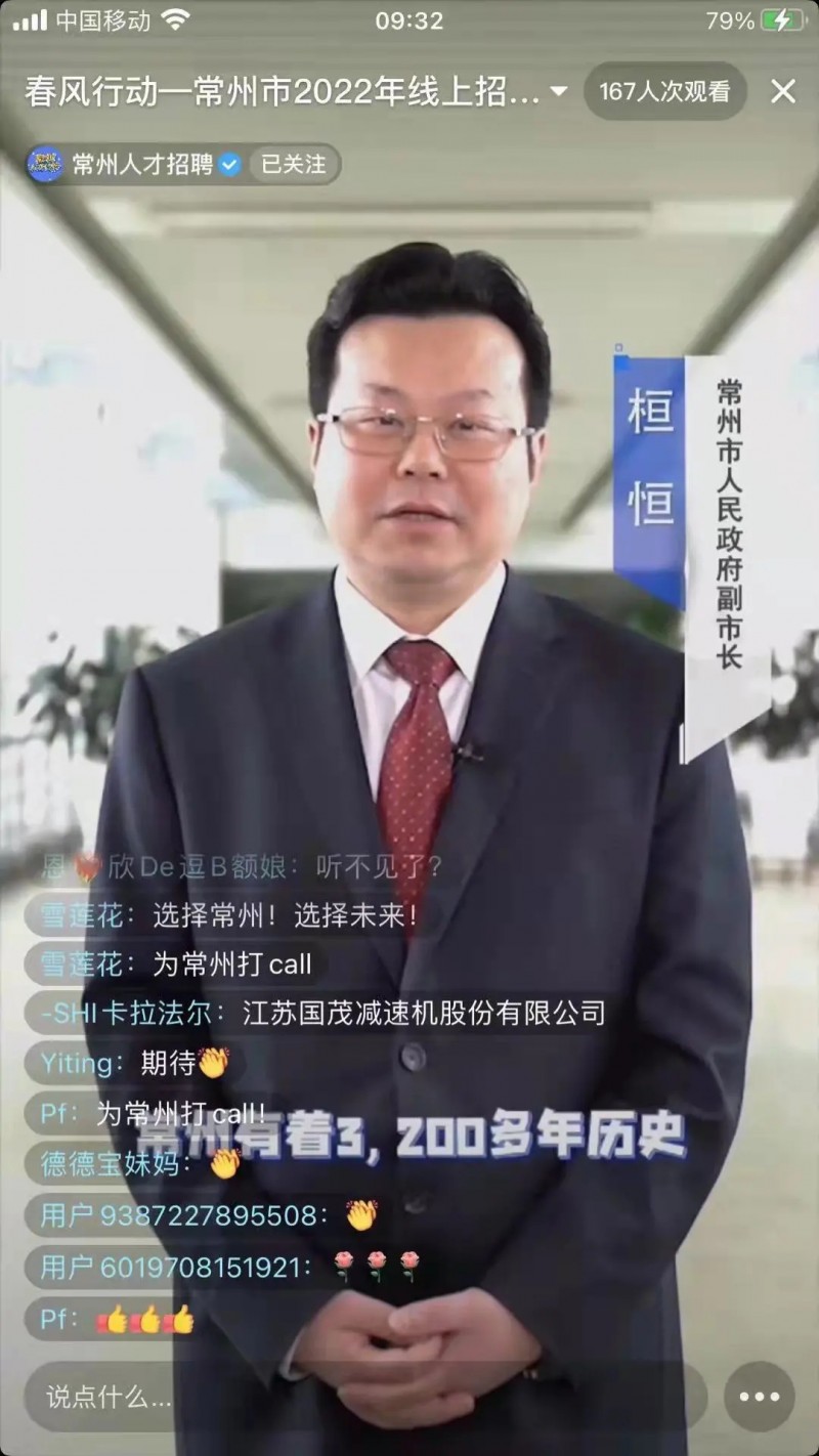直播中,常州市人民政府副市长桓恒、常州市人力资源和社会保障局党组书记、局长嘉秀娟对本次活动高度重视,云集打call,尽显魅力常州。武进区委常委、区人民政府党组副书记、常务副区长刘志峰,常州国家高新区党工委委员、管委会副主任、常州市新北区委常委、副区长李皓也为各自的企业“打气”。