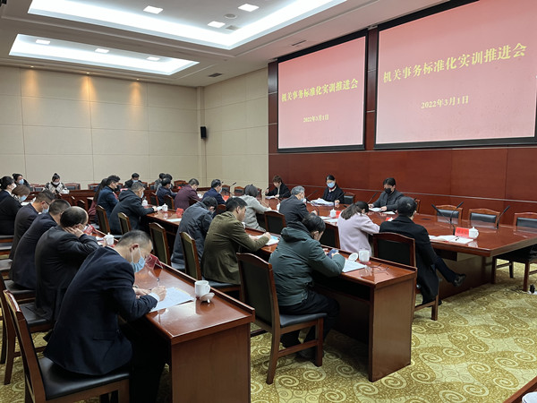 根据“全国机关事务标准化实训试点”工作部署,依据《机关事务标准化实训试点工作评估指引》,2021年6月以来,我局高点定位、高标推进、高质实施,标准化实训试点工作取得阶段性成效。为扎实做好中期评估迎检工作,3月1日,我局组织召开机关事务标准化实训推进暨实训培训会,总结前期工作,就进一步推进标准化实训课程体系建设、实训场地建设、人才体系和师资队伍建设,以及组织开展“标准化标兵示范岗”创建工作进行专题部署。