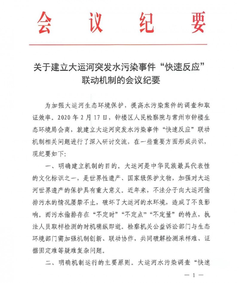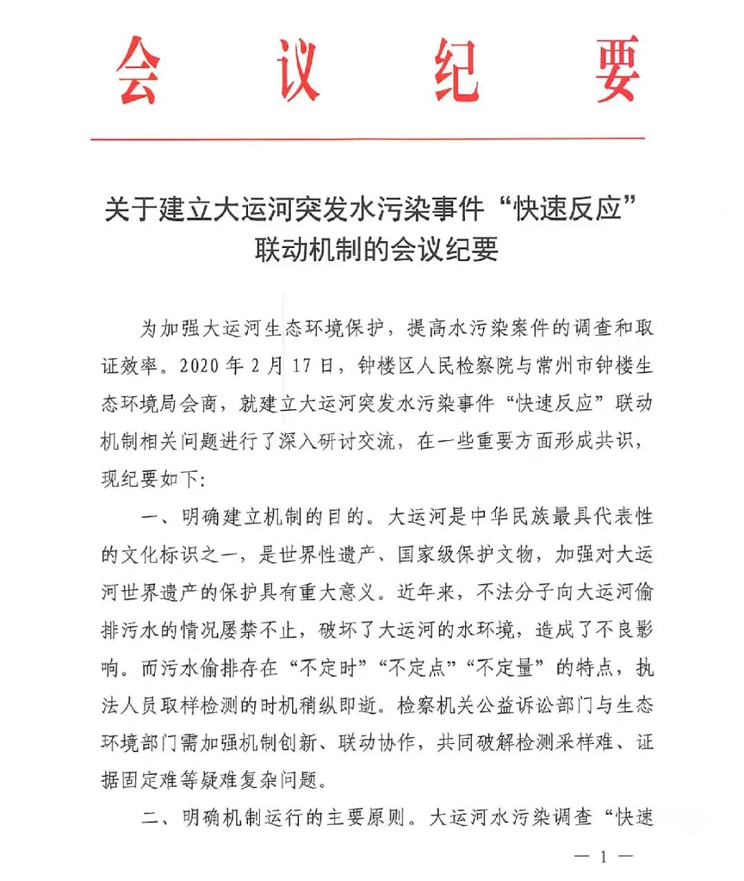 针对这一难题,钟楼检察机关公益诉讼部门与钟楼生态环境局加强工作协同和制度创新,共同推动建立大运河水污染快速反应联动机制,破解了采样检测难、证据固定难等复杂问题,有力的保障了大运河生态环境安全。