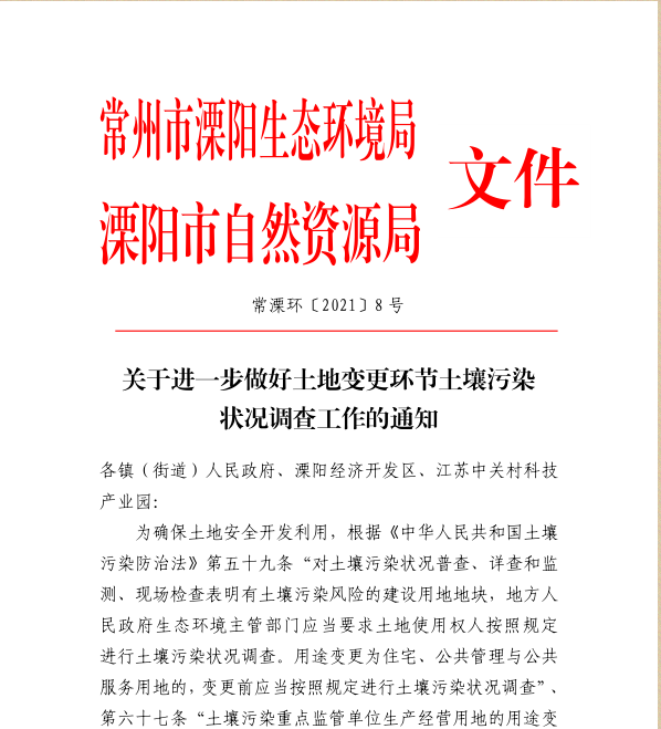 3月25日,常州市溧阳生态环境局会同溧阳市自然资源局联合下发了《关于进一步做好土地变更环节土壤污染状况调查工作的通知》,通知明确了调查对象、调查主体和调查程序等方面内容,进一步加强该市建设用地土壤环境管理工作。