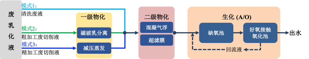 研究团队分析了废乳化液来源工段及排放特征调研,开发了磁破乳分离新技术。与传统化学破乳相比,磁破乳分离时间从240min缩短到10min内,絮体体积比从40%~90%压缩至12%内,解决了破乳后絮体量大、泥水分离难的问题。为了解决技术对不同种类废乳化液普适性的问题,研究团队将磁破乳分离技术、减压蒸发技术、混凝气浮、膜分离、强化生物处理技术耦合,形成了废乳化液的多模式处理工艺。相应技术与工艺已在江苏绿赛格再生资源利用有限公司开展了工程示范,显著提升了废乳化液处理量,降低了处理成本。工程示范的实施使武进区对废乳化液处理能力和技术水平提升了一个台阶,缓解了对区域内含油污染物的环境治理压力,同时也扩大服务到常州周边区域(如苏州、无锡等)的机械加工企业。
