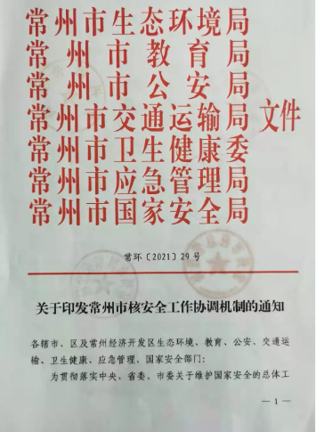 日前,江苏省常州市生态环境局联合市教育局、公安局、交通运输局、卫健委、应急管理局等部门印发《常州市核安全工作协调机制》,在全省第三个建立市一级核安全工作协调机制。