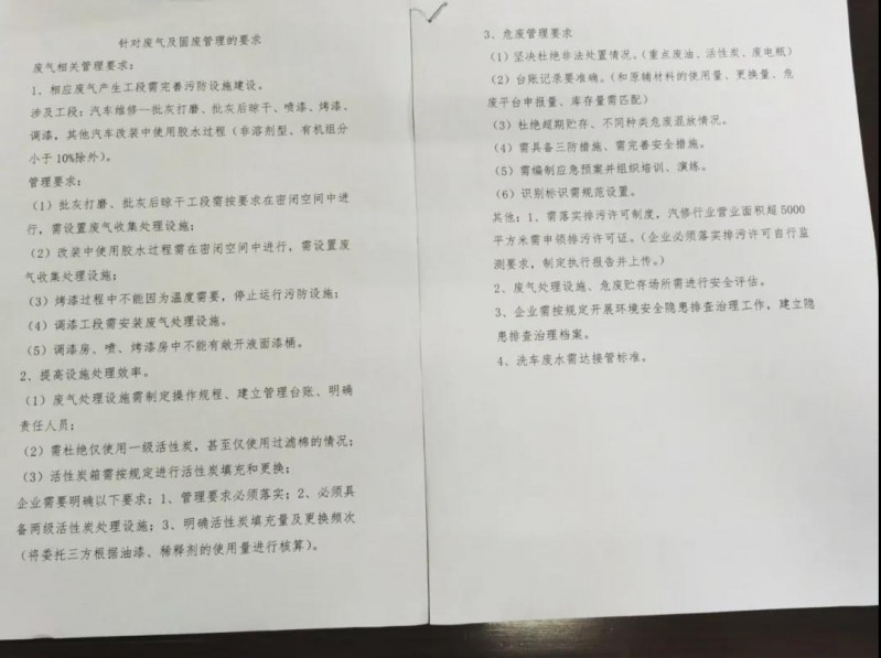 1、在规范管理维修过程中产生的危险废物方面,汽车维修企业应按要求做到分类收集、规范存放、如实申报、合法处置等。