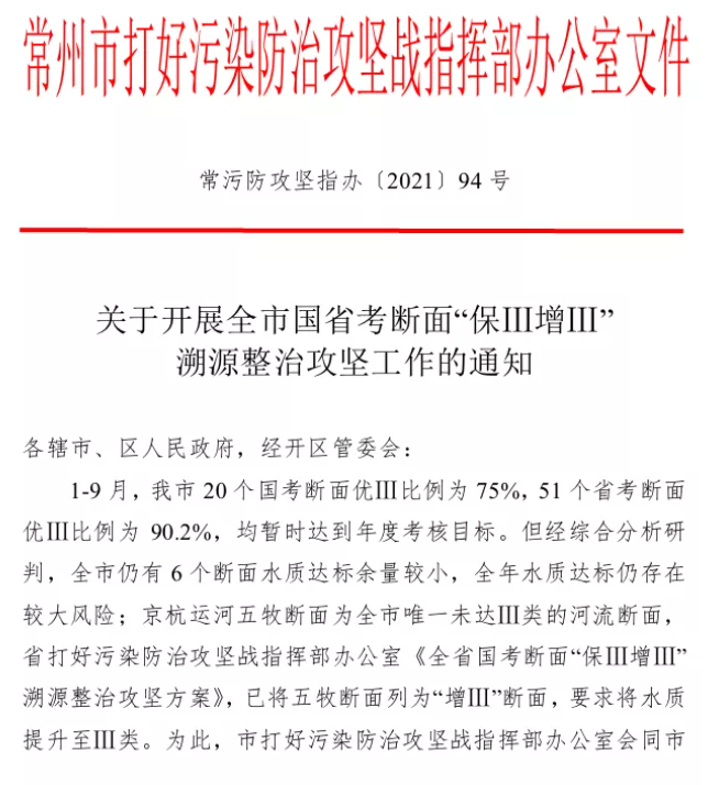 10月以来,常州市响应全省开展国考断面“保Ⅲ增Ⅲ”溯源整治攻坚行动,部门联动,精准施策,全力攻坚京杭运河五牧断面 “增Ⅲ”。