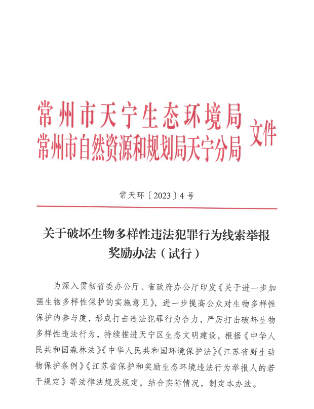 为深入贯彻《关于进一步加强生物多样性保护的实施意见》,严厉打击惩处破坏生物多样性违法行为,持续推进天宁区生态文明建设,进一步拓展生态环境有奖举报范围,形成打击生态环境违法犯罪行为合力,天宁局积极探索创新,主动与区自然资源和规划部门携手并进,在全省首个联合出台了《关于破坏生物多样性违法犯罪行为线索举报奖励办法(试行)》(以下简称《办法》)。