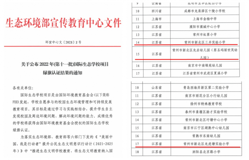 3月22日,生态环境部宣传教育中心公布了2022年度(第十一批)国际生态学校项目绿旗认证结果,新北区新增3所学校参评通过,截至目前共有9所学校成功创建国际生态学校项目,新增数量及总数均列全市第一,实现了该项目的可持续常态化扎根生长,在省、部乃至国际舞台唱响出生态文明教育实践的常州特色好声音。