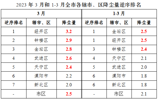 2023年3月,我市省考降尘量均值为2.5吨/月·平方公里,未达考核标准;2023年1-3月,我市省考降尘量均值为2.1吨/月·平方公里,对照《江苏省2023年大气污染防治工作计划》(苏大气办〔2023〕1号)中“常州市不得高于2.3吨/月·平方公里”的要求,达到年度考核要求。各辖市、区中,3月,金坛区、武进区、天宁区、钟楼区、经开区未达考核标准,其余均达考核标准。1-3月,金坛区、钟楼区、经开区未达考核标准,其余均达考核标准。