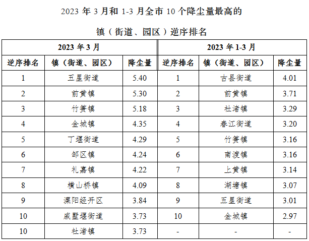 2023年3月,我市乡镇(街道、园区)点位降尘量均值为2.14吨/月·平方公里,1~3月,乡镇(街道、园区)点位累计均值为2.09吨/月·平方公里,均达到考核要求。2023年3月和1-3月全市63个乡镇(街道、园区)降尘量最高的10个乡镇(街道、园区)逆序排名如下表:
