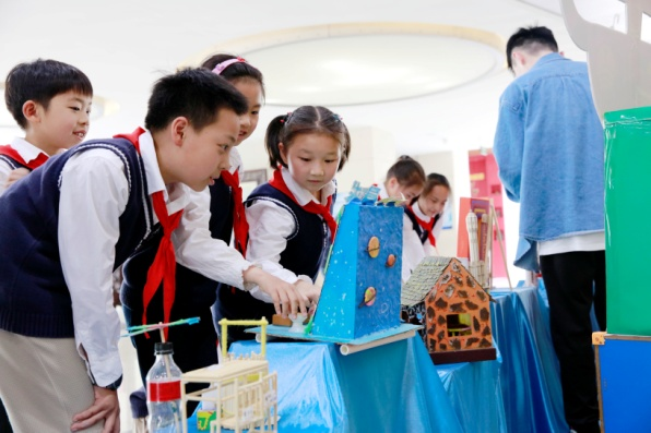 在生态环境科普及绿色校园展示长廊,孩子们用废纸板、废塑料等旧物改造完成各式的卡通贴画、花篮、航天模型等手工制品,践行旧物改造环保理念的同时,也激发了孩子的创造力。为了契合孩子的需求,生态科普运用了大量的漫画、图片,向孩子们科普了低碳生活、绿色校园、垃圾分类、环境保护、生物多样性等知识。