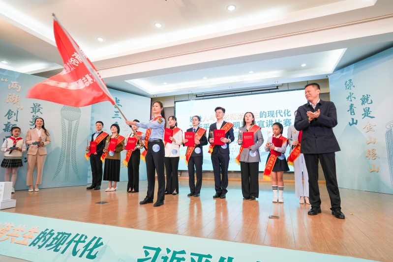整场比赛紧张有序、精彩纷呈,参赛选手们语言生动、感情真挚,让人听之有味、视之有感,赢得了评委和现场观众的阵阵掌声。比赛结束后,常州广播电视台新闻主持人、国家一级播音员张福江对选手表现进行点评,他表示选手能够从自身工作实际出发进行宣讲,让宣讲内容更加生动,同时激励选手用更加深入浅出的语言传播习近平生态文明思想。经过紧张激烈的角逐,共有10名选手获得“常州市十佳生态文明宣讲员”。十佳生态文明宣讲员将成为新时代文明实践生态文明志愿服务队的一员,进社区、学校、企业等进行宣讲,随后市文明办副主任沈玉俊为新时代文明实践生态文明志愿服务队授旗。