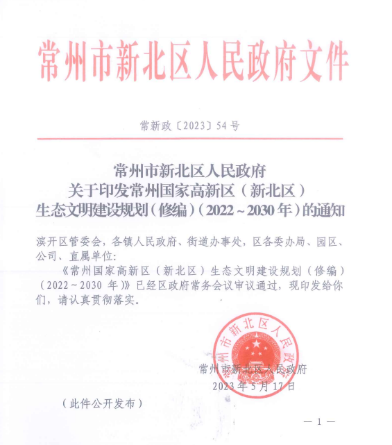 近日,常州市新北区人民政府印发《常州国家高新区(新北区)生态文明建设规划(修编)(2022-2030年)》(以下简称《规划》),规划依据《国家生态文明建设示范区规划编制指南(试行)》的要求,在分析新北区生态文明建设优势和面临挑战的基础上,提出生态文明建设的总体目标、重点任务、重点工程和保障措施,是新北区继续开展生态文明建设的纲领性指导文件。